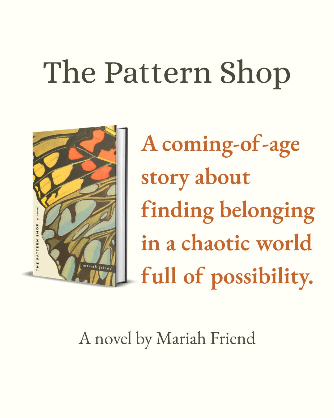 1. I’m moving into the PR/marketing phase of sharing The Pattern Shop and I’d love to be a podcast guest or share more about the story, the self-publishing process, or even do a live Q&A for your book club! Reach out to me at info@mariahfriend.com with ideas for collaborations! If you’ve already reached out in December, I’ll be following up with you soon!